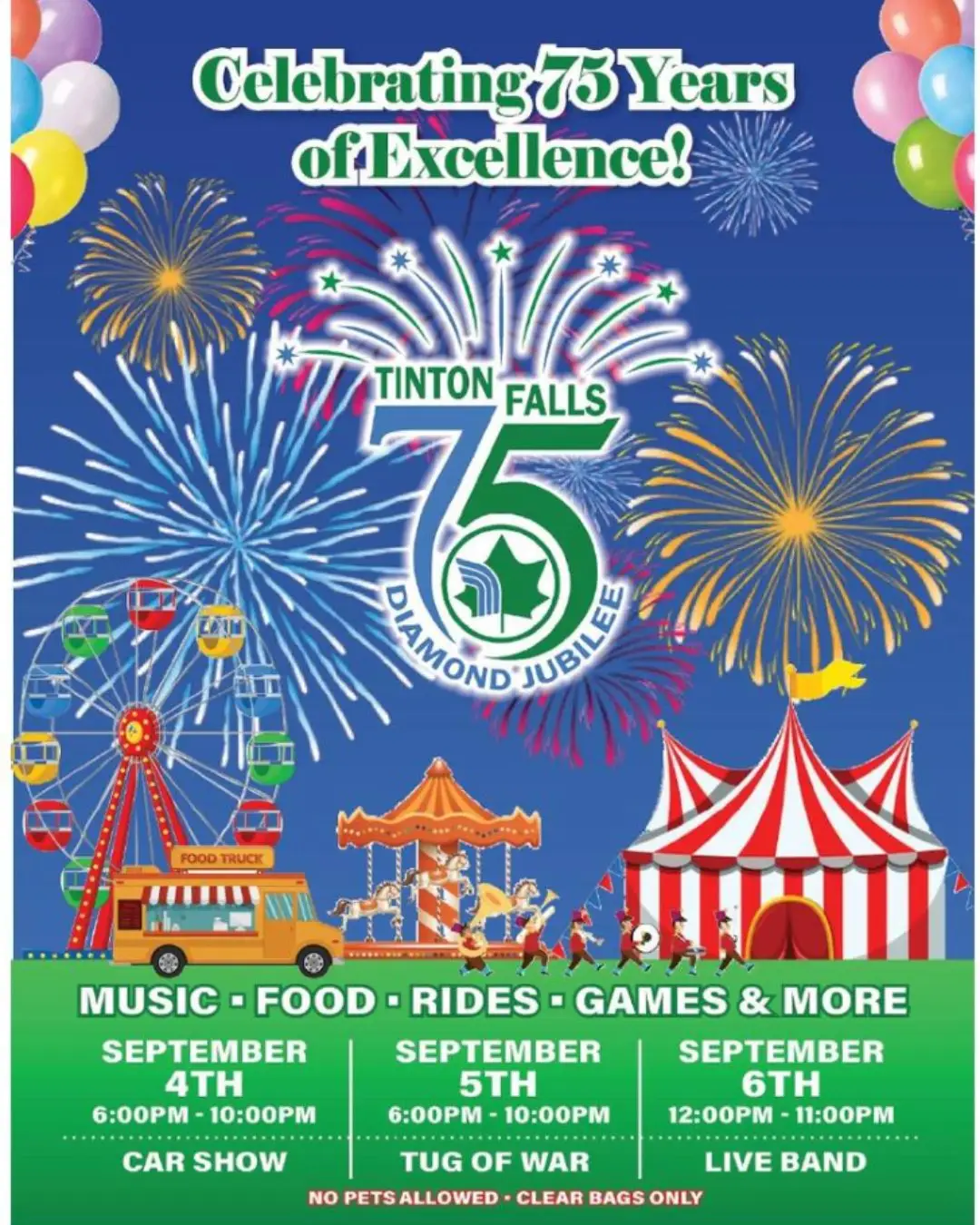 The Borough of Tinton Falls will hold their Diamond Jubilee celebration from Thursday, September 4th, through Saturday, Sept 6th, held at the rec complex on Sycamore Ave.