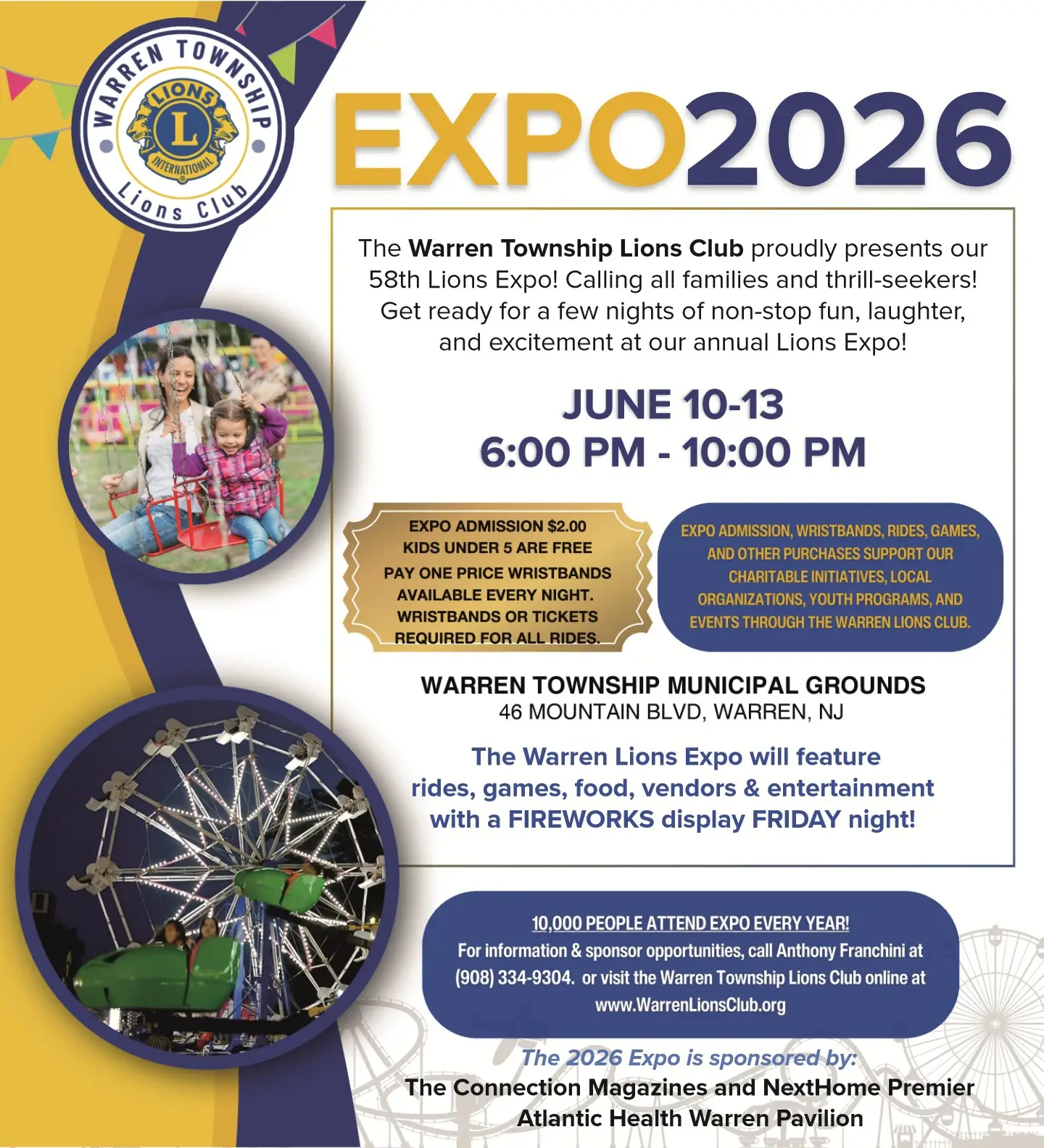 The Lions EXPO 2026 is a four day carnival in its 58 Year.ย The carnival features amusement rides, games, vendors, food vendors and a spectacular fireworks show on Friday evening at 10 pm (rain date Saturday 10 PM)ย For information on vendor space please call Anthony Franchini,ย 9083349304 for info.ย The Lions EXPO brings in over 10,000 visitors every year.